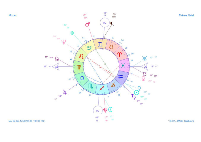 Génie universel de la musique Mozart ne se contenta pas d’être un prodige inspiré. Passionné par la technique musicale et travailleur acharné, il réalisa un travail de synthèse englobant tous les langages musicaux antérieurs et contemporains anticipant même sur les langages futurs. (Soleil-Mercure en Verseau : le génie universel conjoint à Chiron : inspiré ; As Vierge : la technique se mettant au service de son génie musical pour l’aider à se concrétiser.)